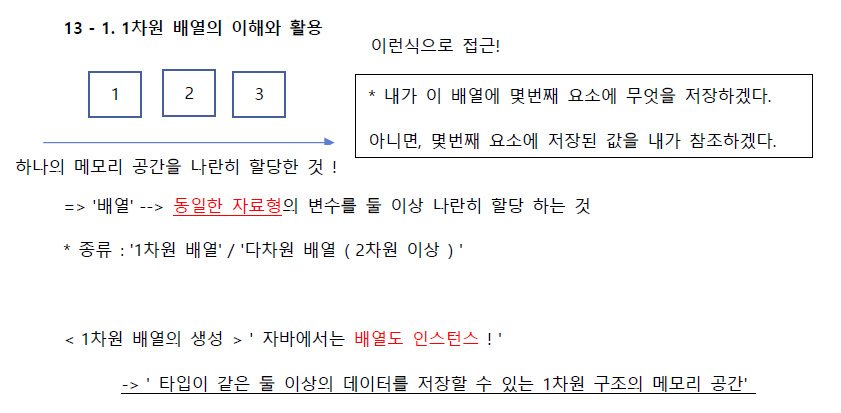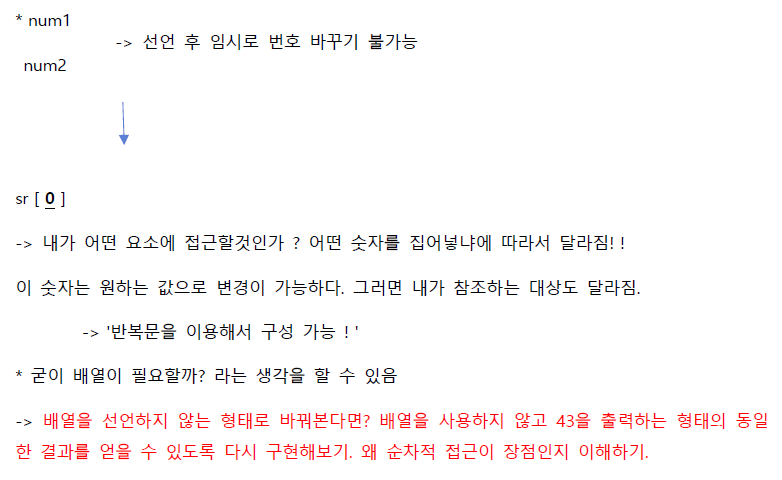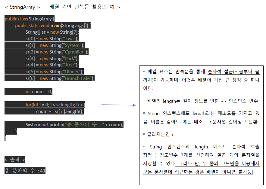 * '배열'이 등장 -> 여지없이 등장하는 것이 'for문' -> ' 배열 요소의 순차적 접근을 위해 등장 '
