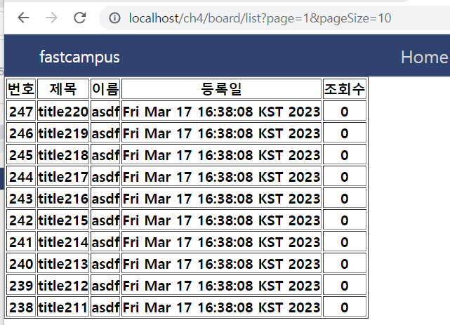 실행한 서버에 http://localhost/ch4/board/list?page=1&pageSize=10값을 입력