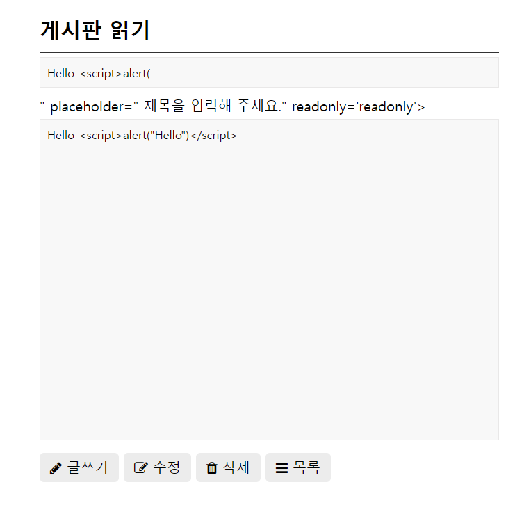 해당 알림과 함께 게시물이 생성된다. 이렇게 스크립트 내용이 들어가게 하면 안되며, 보여줘서도 안된다.