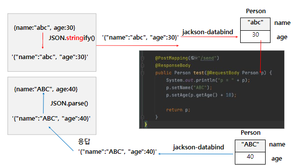 바꿔서 전송한다. 이 요청을 /send POST로 보내면, 서버가 '{"name":"abc","age":30}'를 받고 jackson-databind(라이브러리)가 이 문자열을 Java 객체로 변환해서 매개변수로 넘겨준다.