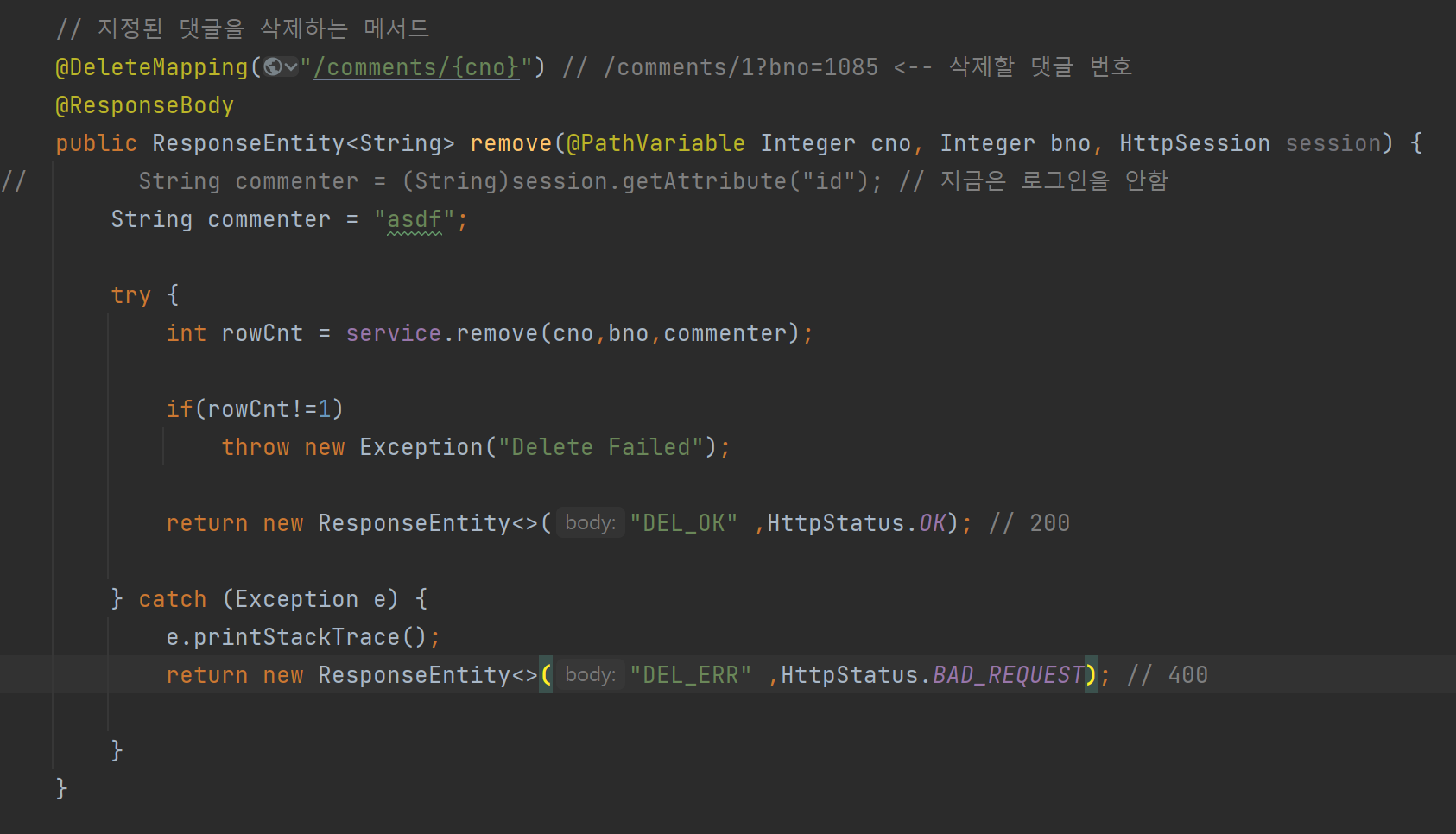 응답이나 요청할 때 전송할 대상은 Entity. 상태코드를 같이 적어서 에러가 발생했을 경우 나타날 상태 코드를 설정해준다.