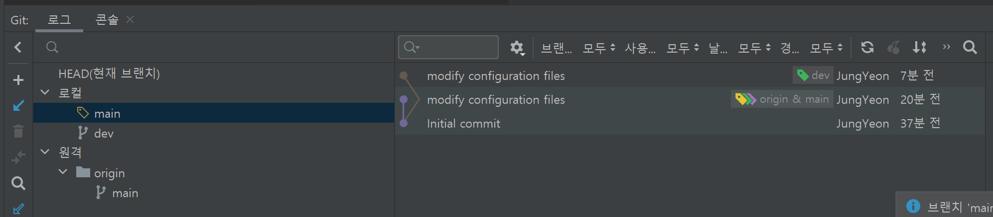 main에서 dev으로 넘어가고, 거기에서 커밋을 만들었으니 dev에 커밋이 생겼다.