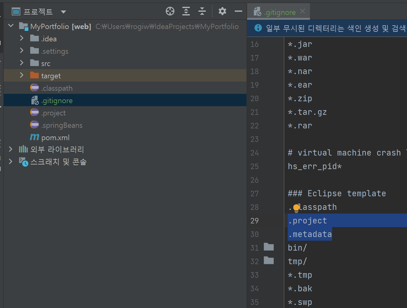 팀프로젝트를 수행할 때 개인 셋팅 파일 커밋은 안올라가는게 좋으므로 설정해준다.