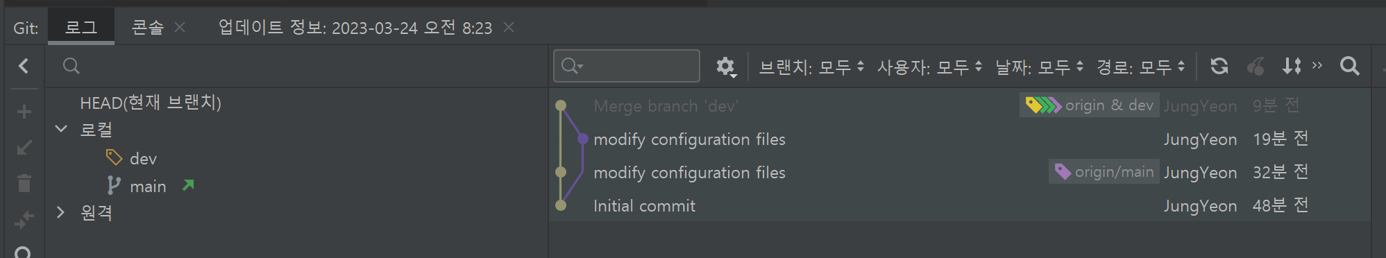그러면 dev 브랜치가 하나 뒤쳐져있다. dev를 main이랑 합치기 위해 dev를 checkout한 후 상단의 Git -> Merge에서
