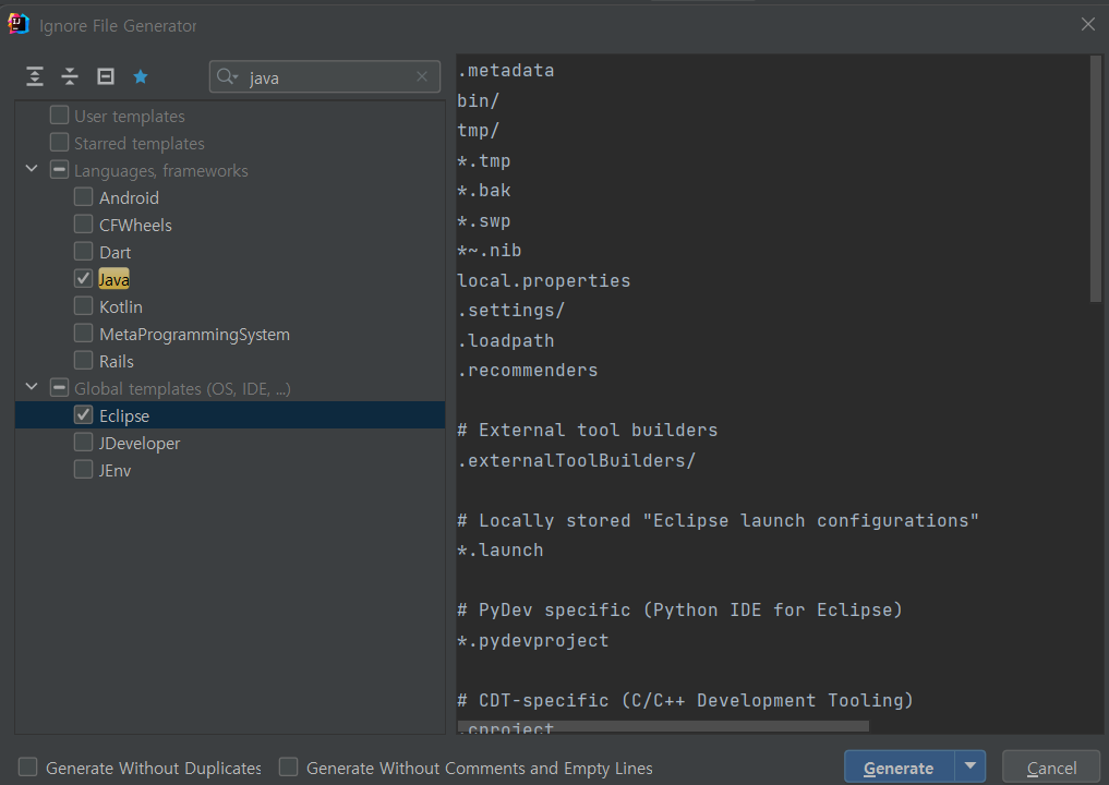 프로젝트 우클릭 -> New -> .ignore File -> .gitingnore FIie(Git)