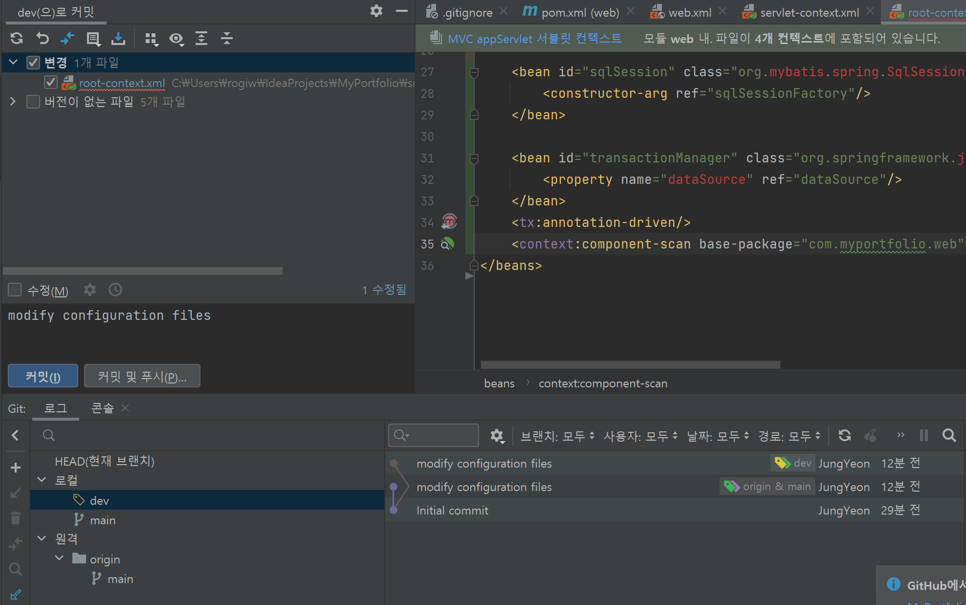 새로운 dev 브랜치를 생성한다. 노란 책갈피 모양이 현재 checkout된 브랜치이다.
