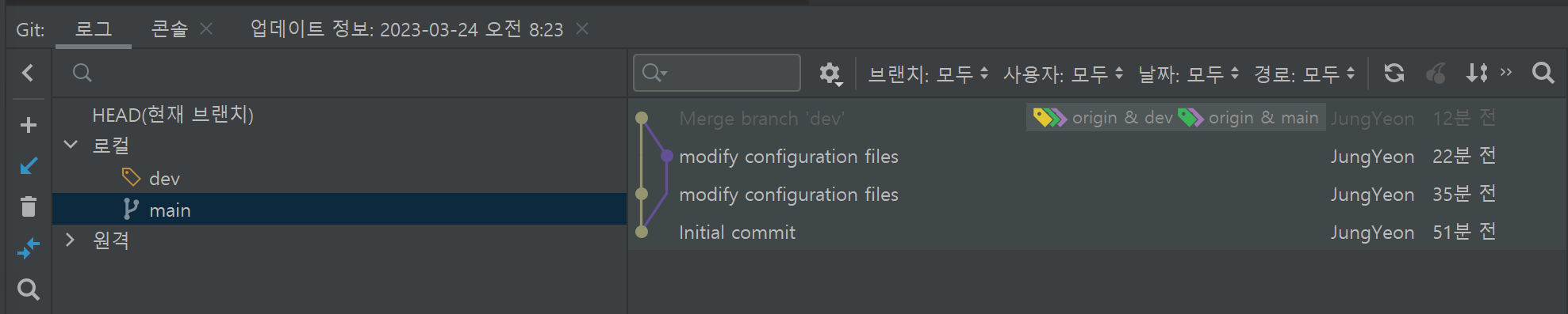 dev 브랜치를 우클릭하고 Merge 'dev' into 'main' 클릭하면 merge가 된다.