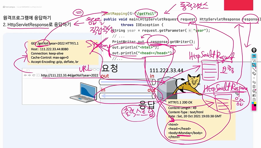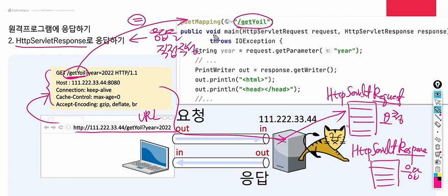 * 여기서 중요한 건 톰캣이 HttpServletResponse객체를 생성해서 줄 수 있다는 것이고,