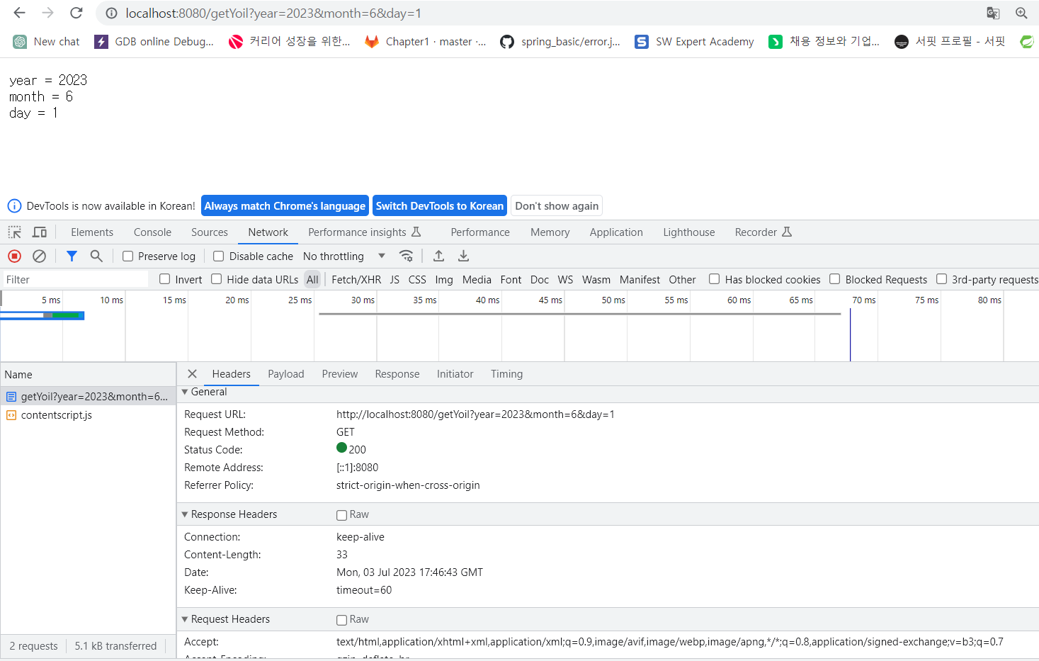 - 이런식으로 헤더 및 응답을 확인할 수 있다.