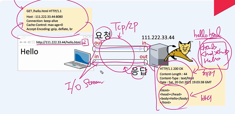 3) 서버가 요청을 받으면 요청한 hello.html파일의 내용을 읽어서 '바디'에 넣는다.(헤더는 톰캣이 자동 완성)