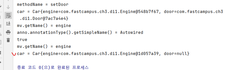 아까와 달리 door도 null이 아니다. 반복문에 의해 setEngine()뿐만 아니라 setDoor()도 호출이 된 것이다.