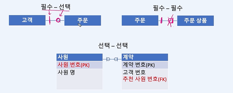 - 선택성(optionality) : 관련 행(row)의 존재가 필수( | ) 또는 선택( O ) 여부