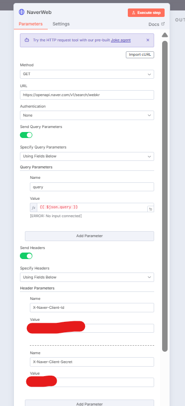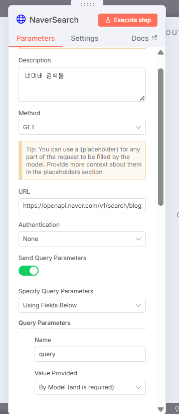 ?query부분은 검색어로 사용되는 부분이며, AI가 입력해줄것이기 때문에 지우고 Query Parameters로 넣어준다.