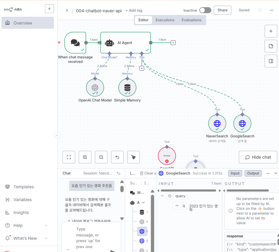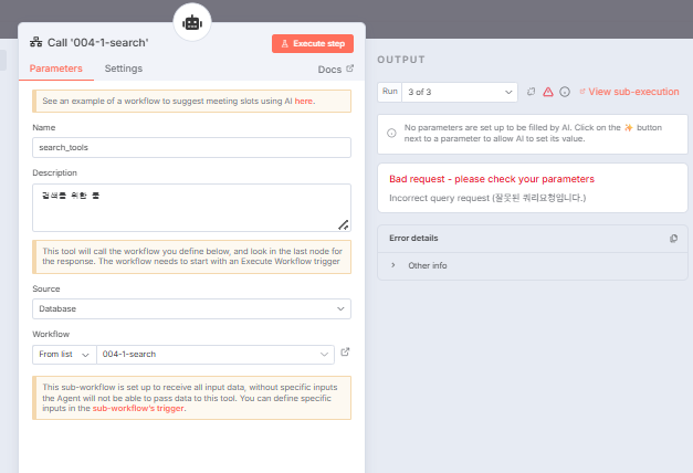 * 검색 기능을 워크플로우 안에 넣어놓고 AI Agent가 이 워크플로우 자체를 호출하게 설정