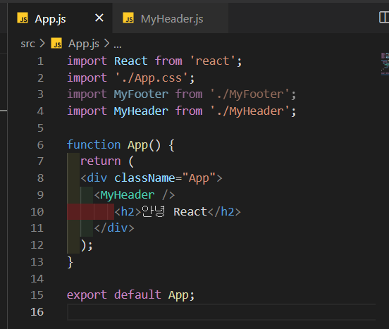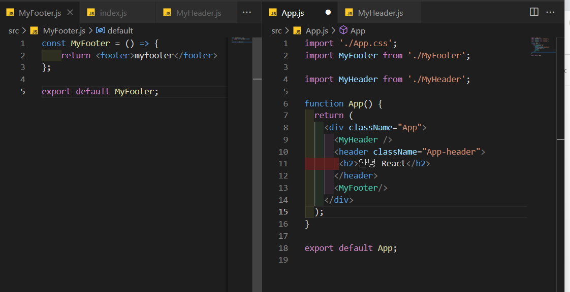 또한, Myfooter, MyHeader에서는 React를 import하지 않았는데 React의 기능을 이용하지 않으면 굳이 안해도 괜찮다.