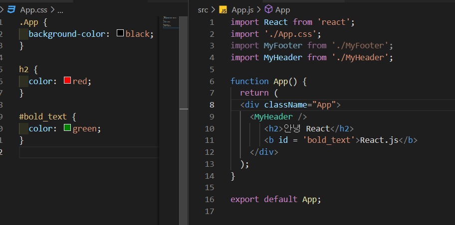 리액트 컴포넌트에서는 import 키워드와 경로를 사용하여 css를 불러다가 사용하고, css요소들이 적용된다.