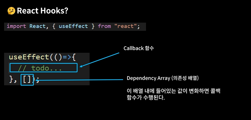 배열에 있는 값이 하나라도 변화하면, 첫 번째 parameter인 콜백 함수가 다시 수행 된다.